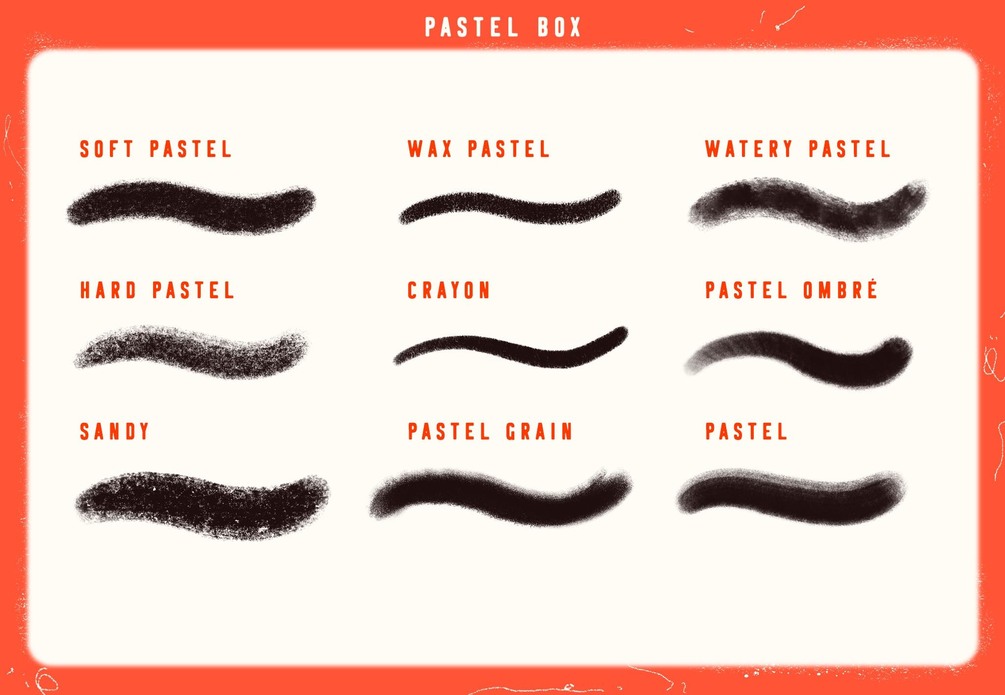 This is a set of 9 pastel brushes. You will find some more dusty, waxy and watery. Some of them are smooth and others are rough.